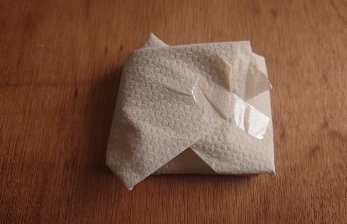 乾燥させたドリップかすをキッチンペーパーに包み、見た目無視(どうせ見えないしw)でセロハンテープで雑に止める。それを靴箱の中にポイっと無造作に置く。これが思ったより消臭と除湿効果が高い(自己検証です(笑))
