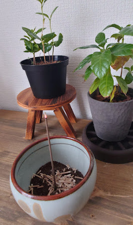 器に入れて、そのままお香立て代わり。灰もちゃんと受けてくれるし、ついでにちょっと消臭もしてくれるので、これが地味に便利♪
