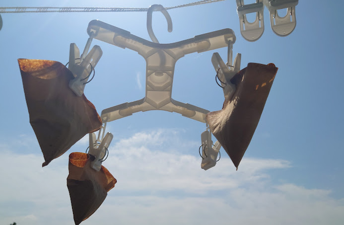 ドリップ終えたドリップペーパーのまま、洗濯物を干すかのように吊るし、